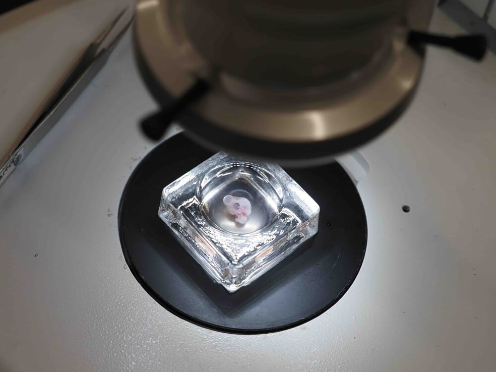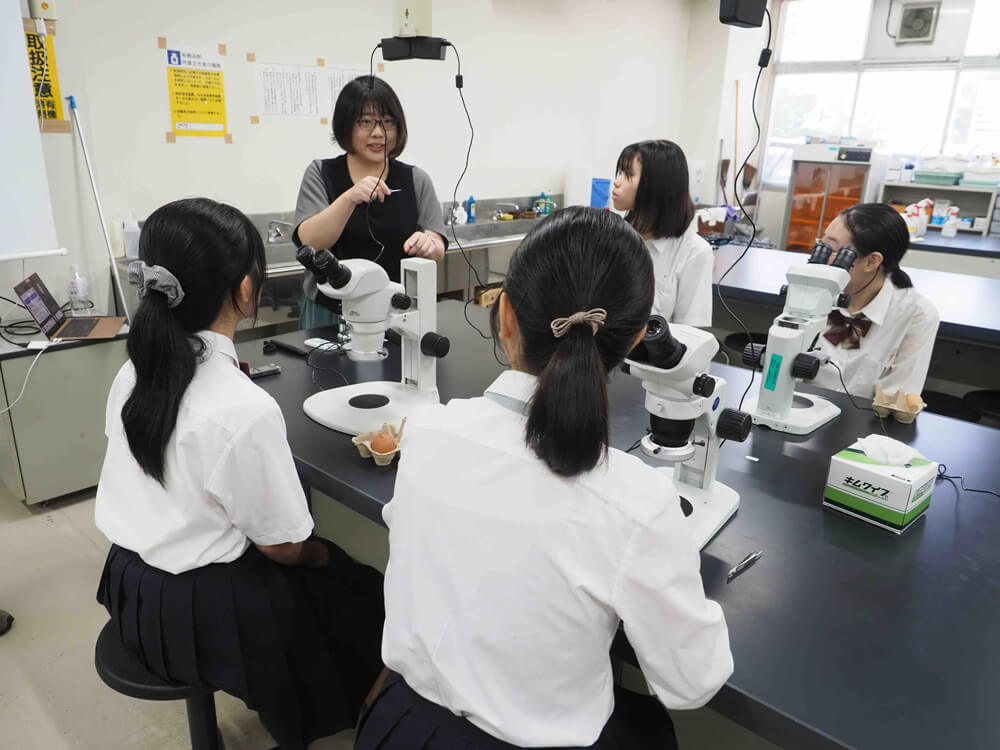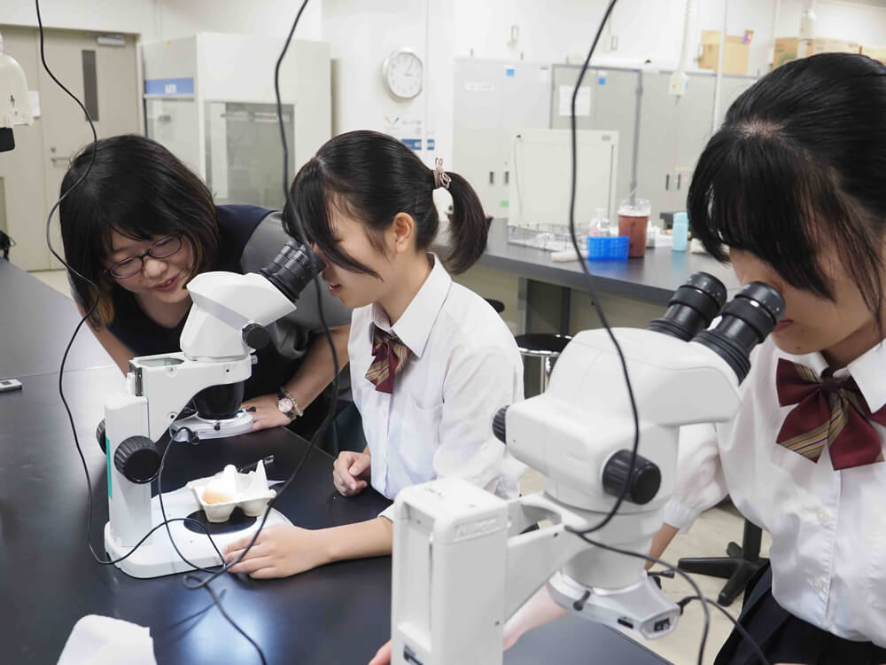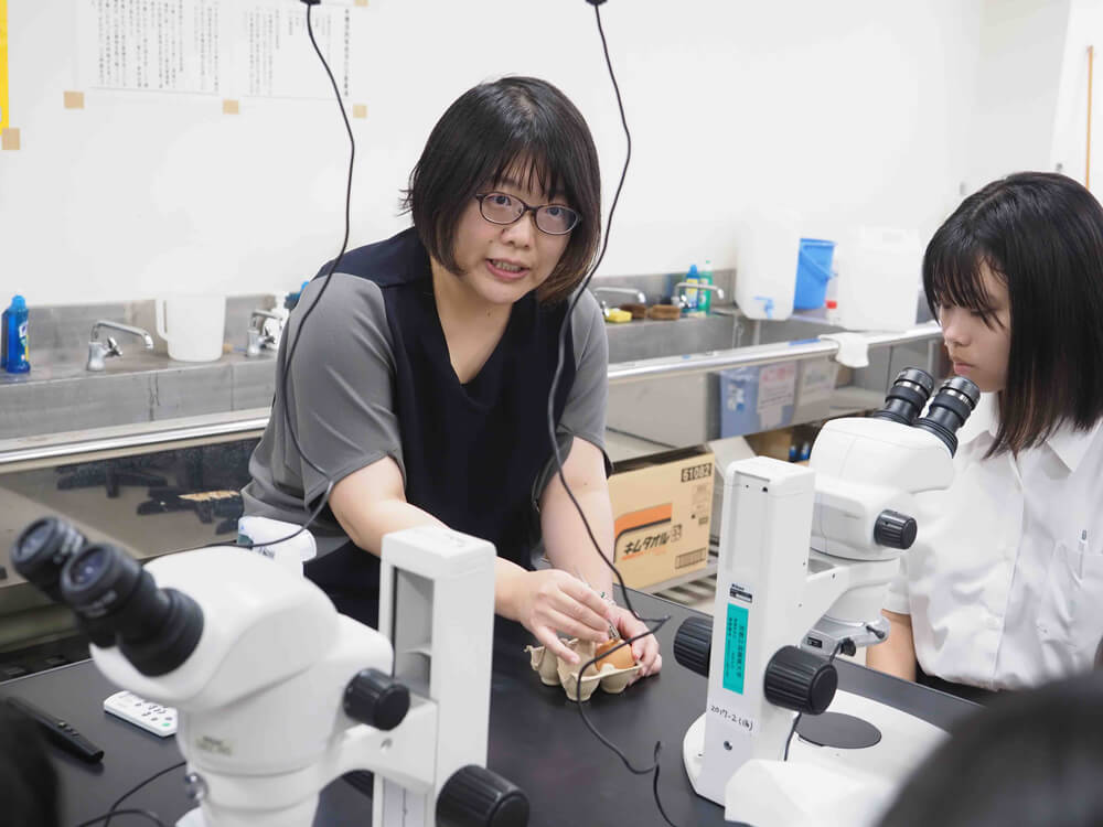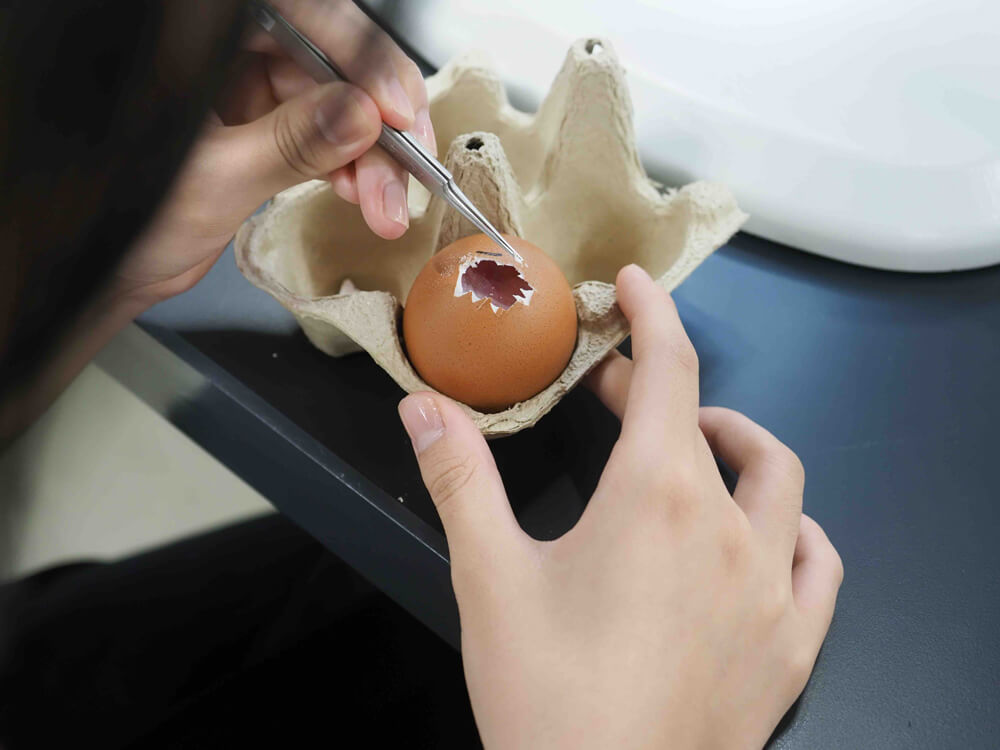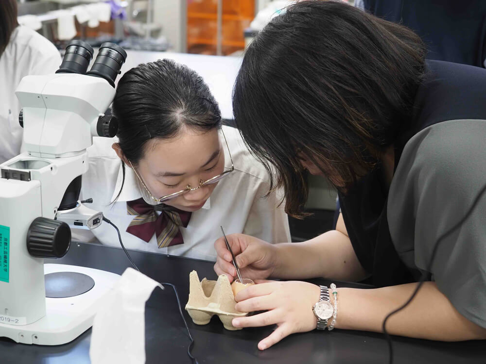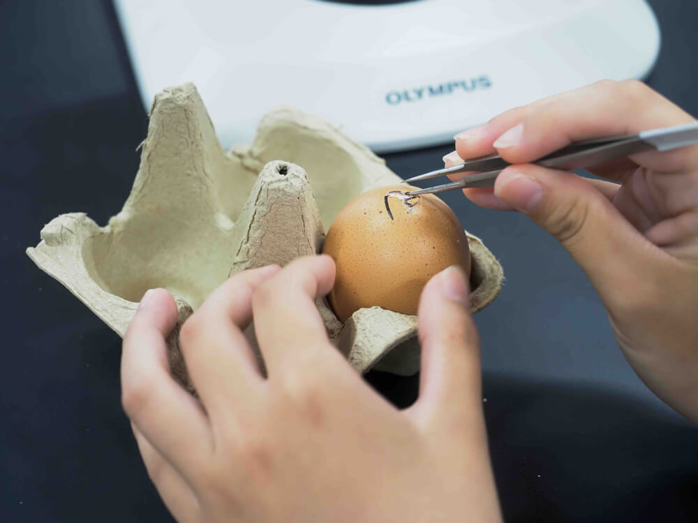 しっぽ学の集中講義を終えた後、東島先生が事前に準備してくださった有精卵で発生段階の異なるニワトリ胚を観察。卵の殻を割りながら、そして顕微鏡をのぞきながら、さまざまなやりとりが行われました。