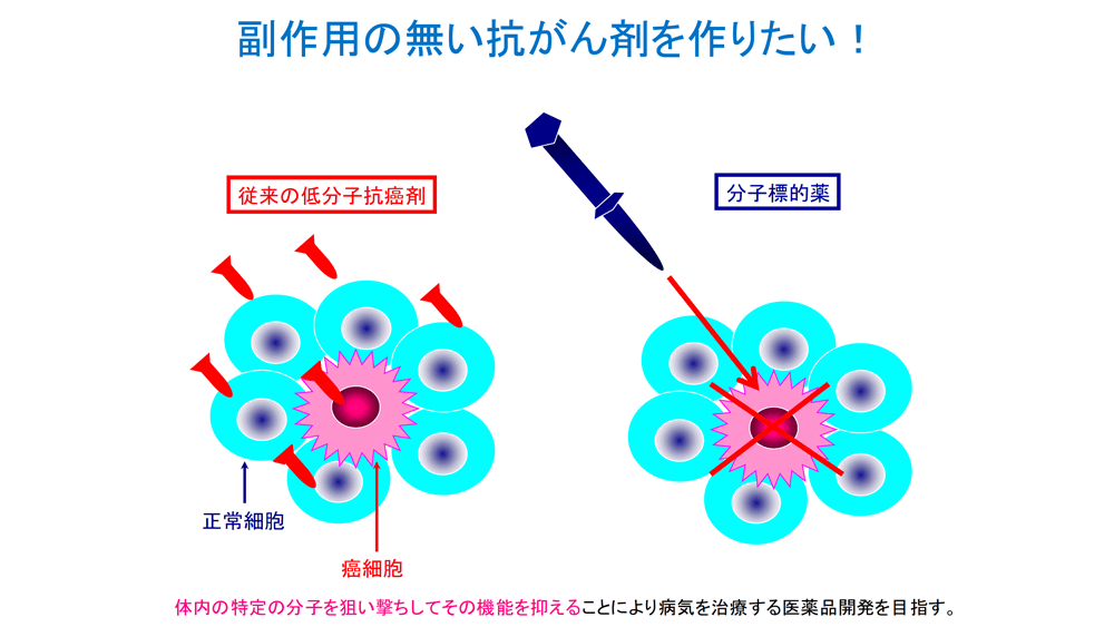 - 私の夢は、副作用のない抗がん剤を作ること。では、そもそもなぜ副作用があるのか? それは、従来の低分子抗がん剤はがん細胞だけでなく、正常細胞も殺してしまう薬だったからです。それに対して、最近はとてもいい薬ができています。分子標的薬と呼ばれ、がん細胞のある特定の分子だけを狙い撃ちし、その機能を抑える。この、ある特定の分子にだけに結合する点が重要で、がん細胞が持っているけれど、正常な細胞は持っていないものを狙うことができます。