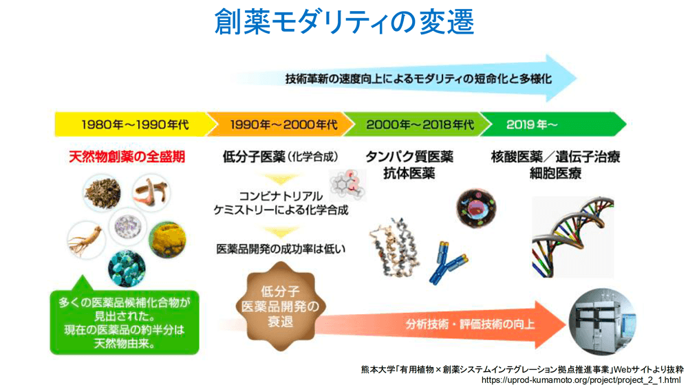 - 「創薬モダリティ(modality)」って聞いたことがありますか? 薬の形態や分類のことで、大昔は薬草の根などをすりつぶして煎じていたけれど、有機化学で合成できるようになって低分子医薬品が作られるようになりました。現在は、核酸やタンパク質など大きい分子でより特異的に狙えたり、遺伝子が薬になったりしています。