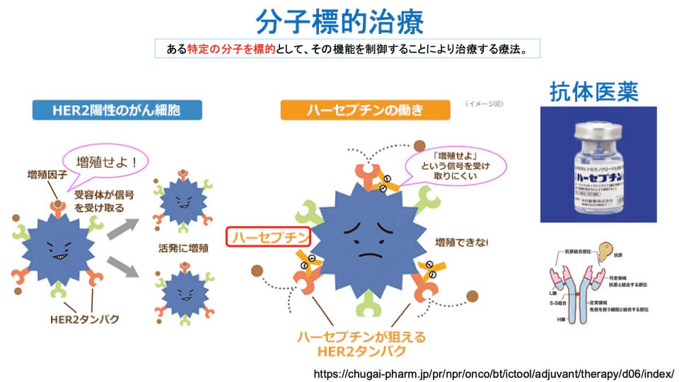 まず、異物を攻撃する免疫の仕組みを利用し、病気の原因となる細胞やタンパク質だけを狙い撃つ抗体医薬。その1つ、乳がんや胃がんの治療に使うハーセプチンは、「増殖せよ」という信号を受け取るがん細胞特有のタンパク質(HER2タンパク)を認識して結合し、その信号が入らないようにする薬です。これによってがん細胞の増殖を抑えることができます。