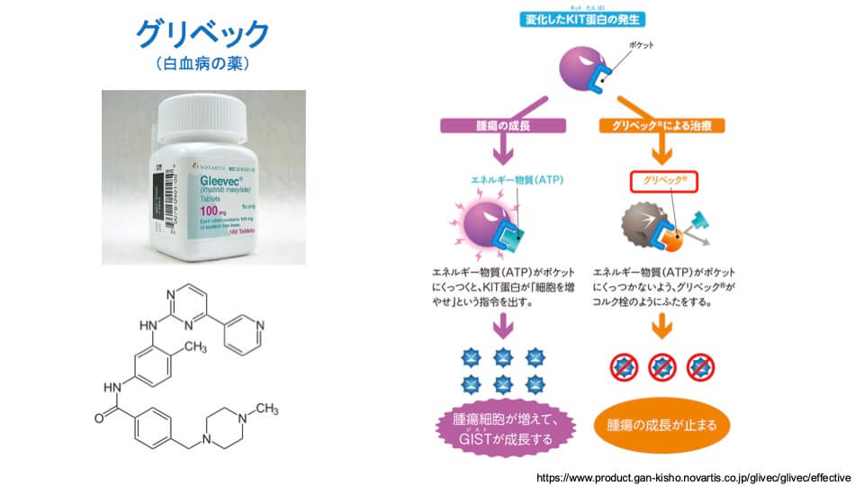 - グリベックという白血病の薬は、細胞の増殖・分化に関与するKIT(キット)タンパクの異常な活性化を抑える働きを持っています。KITタンパクのポケットにエネルギー物質がくっつくと「細胞を増やせ」と指令が出るのですが、グリベックがコルク栓のようにふさいでくれるので腫瘍(しゅよう)の成長が止まります。