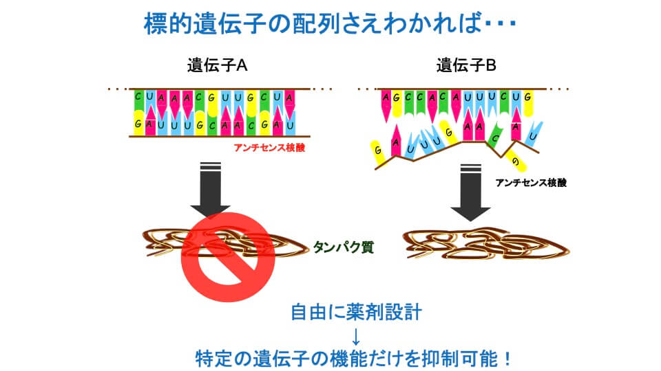 ※アンチセンス(Antisense): タンパク質をコードするmRNAと相補的な塩基配列を持つ一本鎖のDNAまたはRNA。