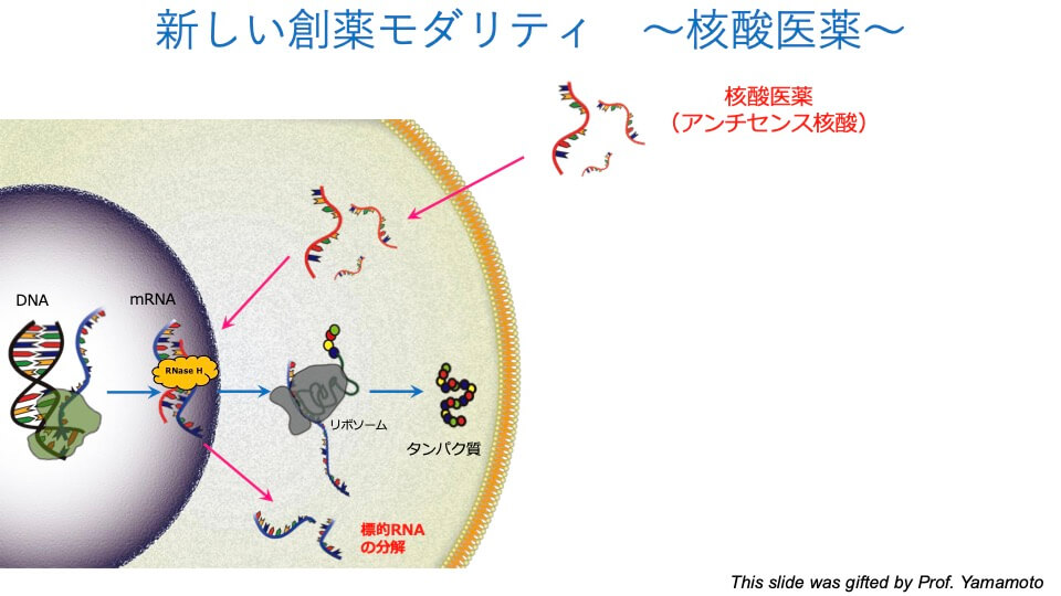 - 次に、研究での「気づき」。今、核酸医薬はものすごく流行していて、製薬企業が次々と声を掛けてくるほどです。でも、数年前までは「核酸なんか薬になるか」という時代でした。実際、私が学会で発表したら、「核酸が薬になるわけない」と言われたことも。