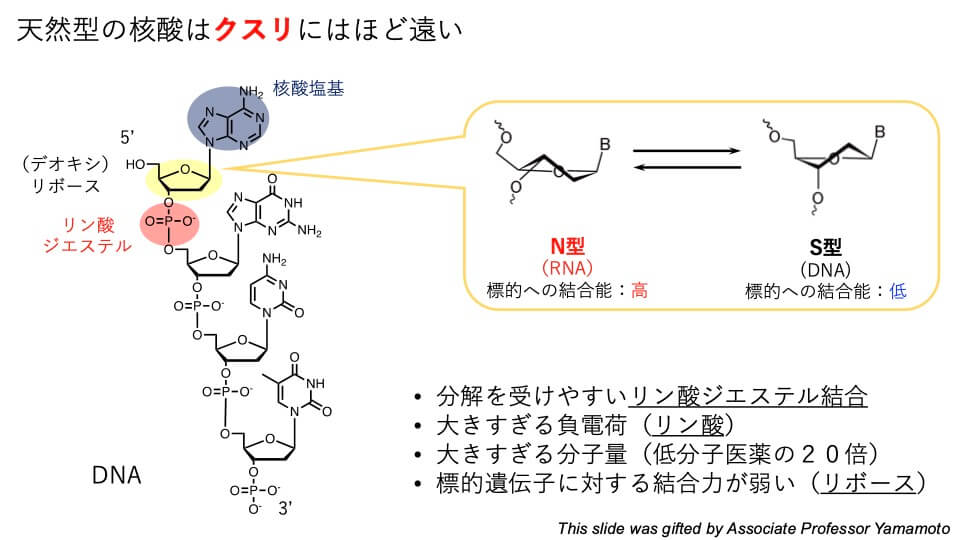 - 人工核酸と違い、天然型の核酸は薬にはほど遠いんですね。というのも、天然型の核酸は細胞に入りにくい上に、分解しやすいため、細胞内に入れてもすぐに切れてしまいます。また、標的遺伝子に対する結合力が弱いことも薬として使えない理由の1つです。