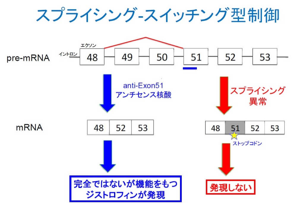 - 2020年3月に薬事承認された日本初の核酸医薬・ビルトラルセンは、53番目のスプライシングがスキップされて51、54となる。少し短いのですが、機能するジストロフィンができ、DMDの患者さんの延命を実現しています。