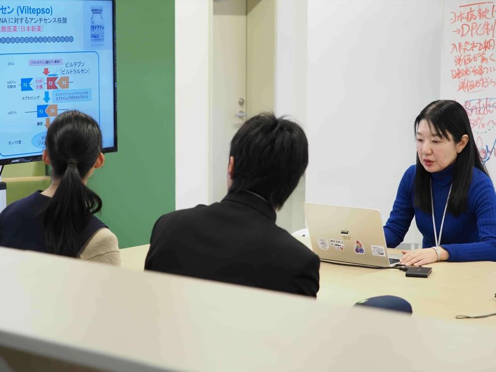 今日はこの後、実験室を見ていただきます。核酸医薬は、遺伝子の配列が分からないと、そこにくっつけるものを設計できないので、遺伝子診断に使われている手法を外山さんに説明してもらいます。あと、培養しているがん細胞を顕微鏡で見ていただく予定です。