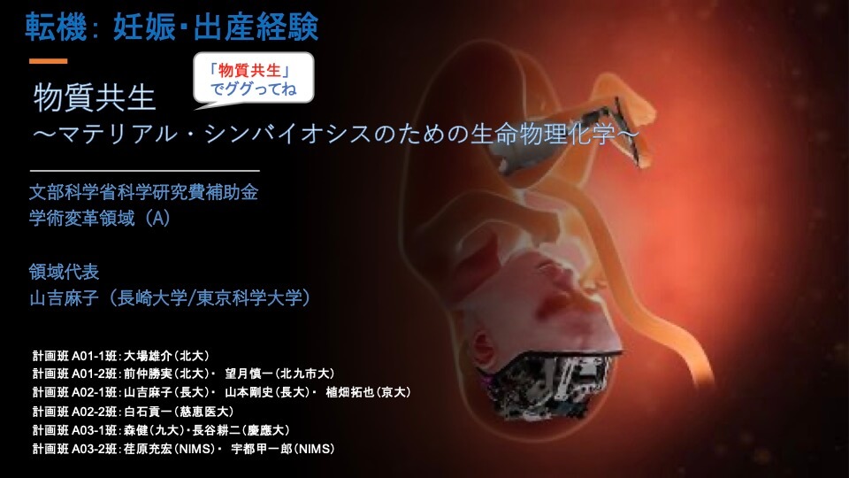 - 私が妊娠・出産を経験する中で着想した文部科学省の大型プロジェクトについて紹介しましょう。従来の学術の体系や方向を大きく変革・転換するための研究で、予算は年間最大で3億円。私たちは、マテリアルと生体との共生状態を「マテリアル・シンバイオシス(物質共生)」と定義し、その解明を目指して2020年から5年間取り組みました。