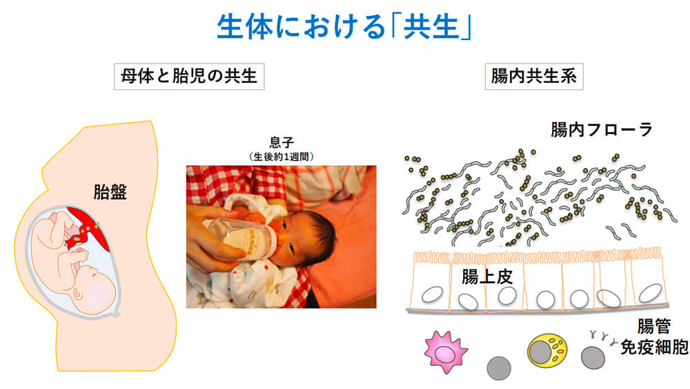 - 生体にはさまざまな共生状態があります。例えば、母体にとって胎児は異物ですが、胎児を排除しないのは、胎盤が胎児を異物ではないというシグナルを入れているからです。