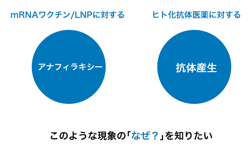 - 「共生」という視点を取り入れることで、mRNAワクチンに対するアナフィラキシーやヒト化抗体医薬※で起きる異物反応といった現象の「なぜ?」に迫ることができるのではないかと考えたのです。