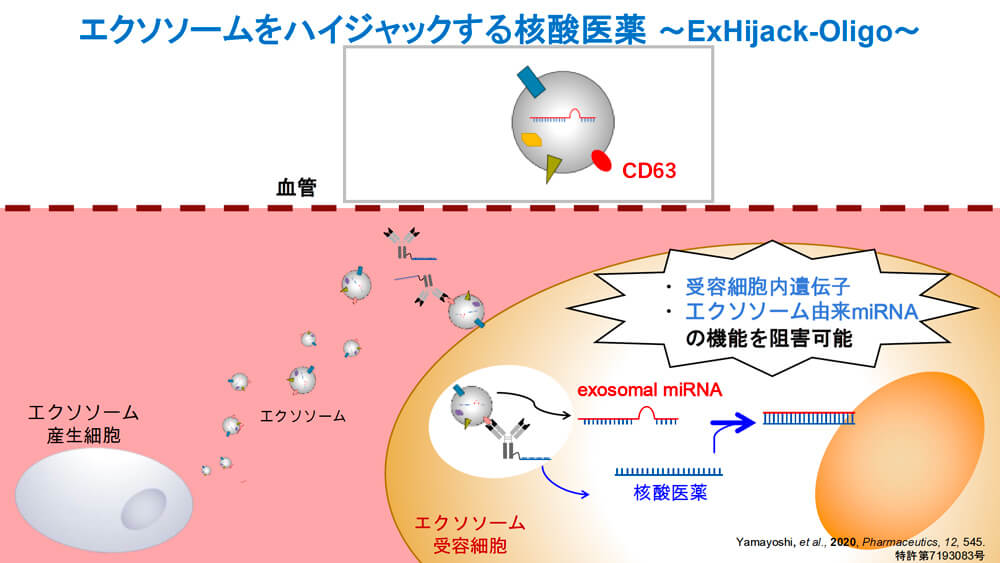 - こういったことを回避する技術として私たちが着目したのがエクソソーム※です。細胞はエクソソームという細胞外小胞を放出し、その中に遺伝子などを入れて他の細胞に送っているのですが、これを用いて核酸医薬をデリバリーしようと。