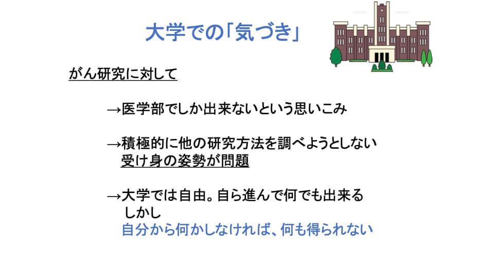 - 講義の最後に、私が経験した4つの「気づき」について話したいと思います。まず、大学での「気づき」。大学進学で、私は医学部を目指していたのですが、結果は不合格。当時、がんの研究は医学部でしかできないと思い込んでいて、落ちた時はかなりショックでした。ただ、その時、それ以外の方法はないのか自分で調べようとしなかったことも問題だと思っています。皆さん大学に進学されるでしょうが、大学は本当に自由。ただし、自分から何かしなければ何も得られないので、ぜひ今からいろいろ考えてほしいなと思います。