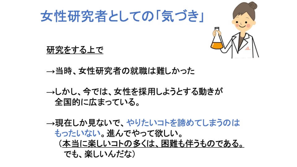 - 3つ目が、女性研究者としての「気づき」。かつて女性研究者の就職は厳しかった。大学で研究室を選ぶ時、「女子は就職の世話が大変だから、うちの研究室には来るな」と言う教授がいたくらいです。村上先生は女性研究者を応援してくれる研究者でしたが、「君は女性だから、男性より頑張らないといけないよ」と。