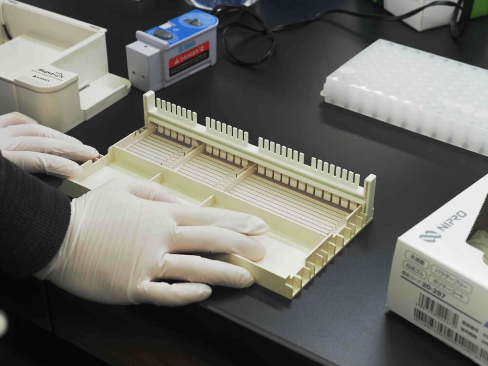 - じゃあ、やってみましょう。まず電気泳動装置の泳動槽にバッファーを入れます。バッファーとは、pHを調整したり電気が流れやすくなるなど、ゲルの中に核酸を移動させやすくするための液体。ただし、今回使うのはただの水です。