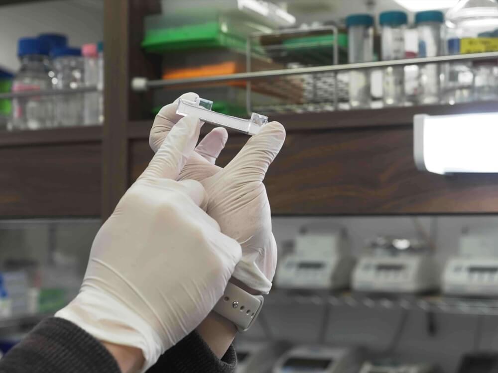 - 次に、液体を精密に計量・分注する器具「マイクロピペット」を使い、溶液を吸い上げてゲルの穴に入れます。