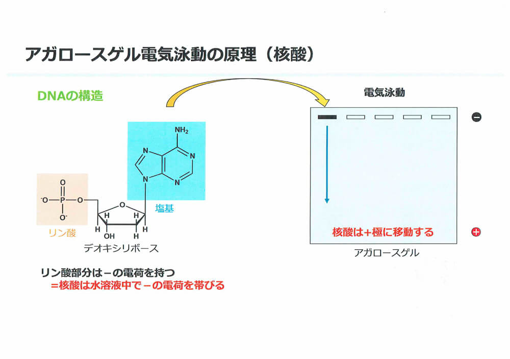 - DNAやRNAのリン酸基はー(マイナス)の電荷を持っています。そのリン酸基がつながった核酸は、全体としてマイナスの電荷を帯びているので、電気を流すと+(プラス)側に引き寄せられる。核酸がプラス極に流れるという性質を利用したのが、電気泳動です。