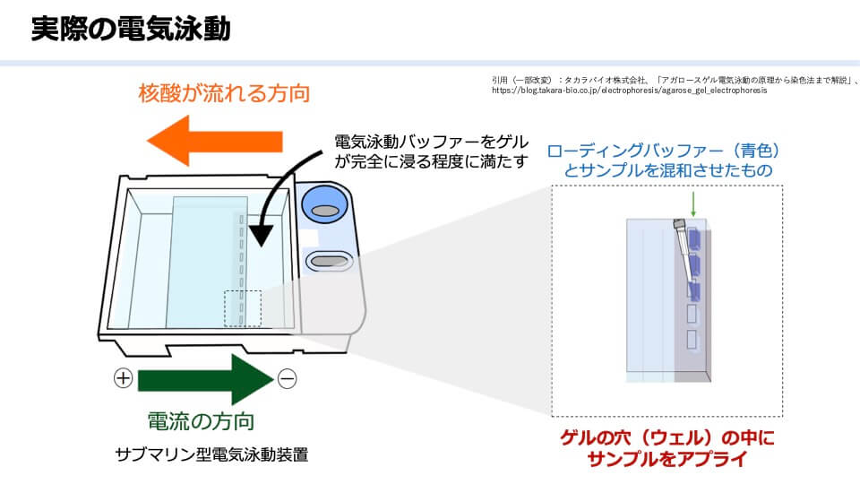 実際にはこの後、電気を流して泳動の様子を観察します。