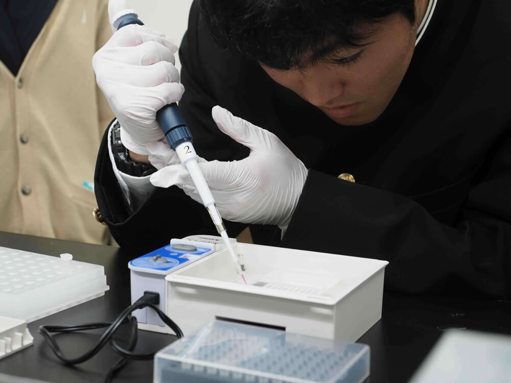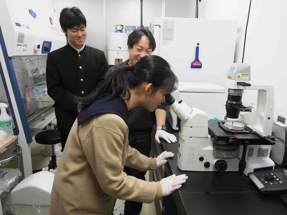 山吉先生のお話を聞いた後に訪れた実験室では「アガロースゲル電気泳動」実験を模擬体験し、培養している「がん細胞」を顕微鏡で観察しました。生徒の皆さんに分かりやすく説明してくださったのは、外山さんです。