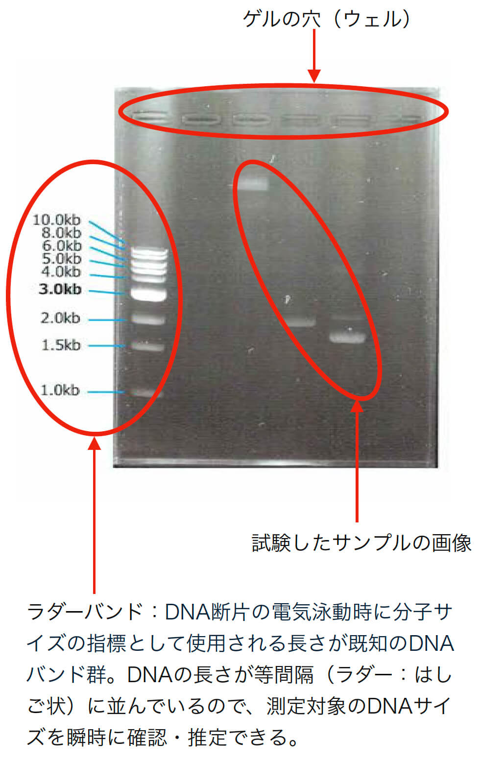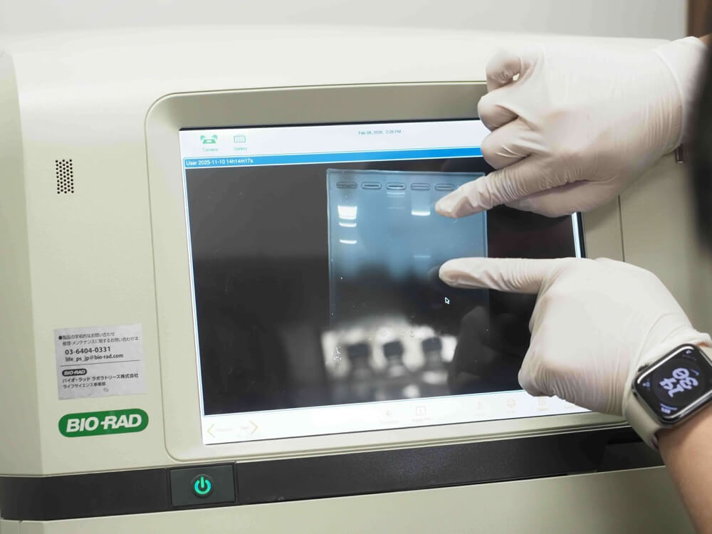 - 画面左側に表示されているレーンをラダーバンドといいます。これは売られている蛍光試薬なので、あらかじめ分子量が決まっています。しかし、右側のサンプルは、自分が入れたものだから実際の分子量が分からない。そんな時、左側と比較すれば、だいたいどのぐらいの大きさなのかを決めることができるというわけです。