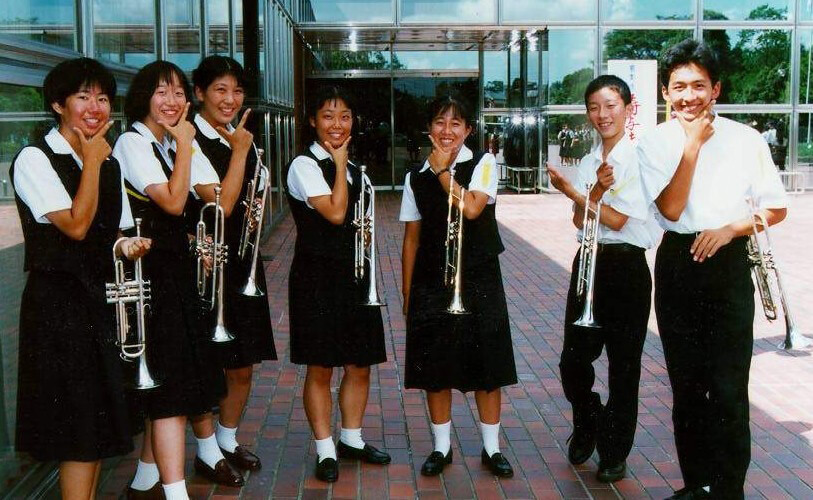 高校時代のトランペット仲間(右から2人目)。当時流行のセーラームーンポーズをしているものの、浮いている。