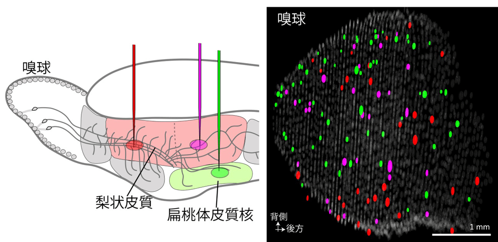 トランスシナプス標識法によって、嗅球の広い範囲に散在する糸球から、脳のさらに奥の梨状皮質*(りじょうひしつ)や扁桃体へとにおい情報が高次領域に伝わっていくこと、嗅覚皮質の場所によって情報伝達方式には違いがあることなどが明らかになりました。