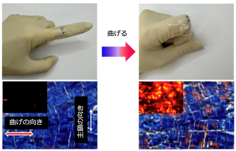 力を加えると色を変えたり発光したりするポリマーであるポリジアセチレンの主鎖を力の方向に対して垂直に配置することで、感度が最大14倍に向上。色の変化で力を可視化するウェアラブル・センサーとして応用できる。
