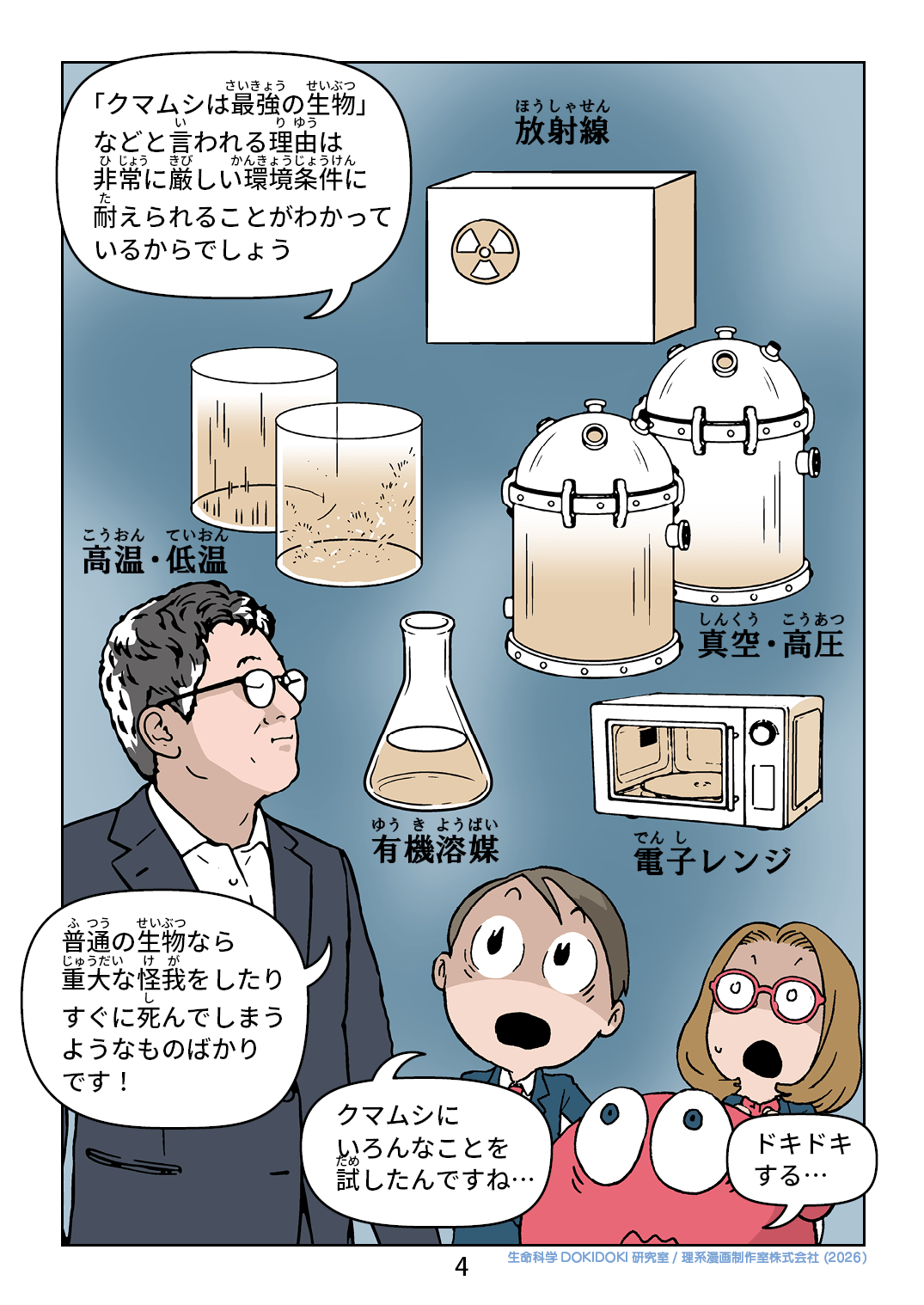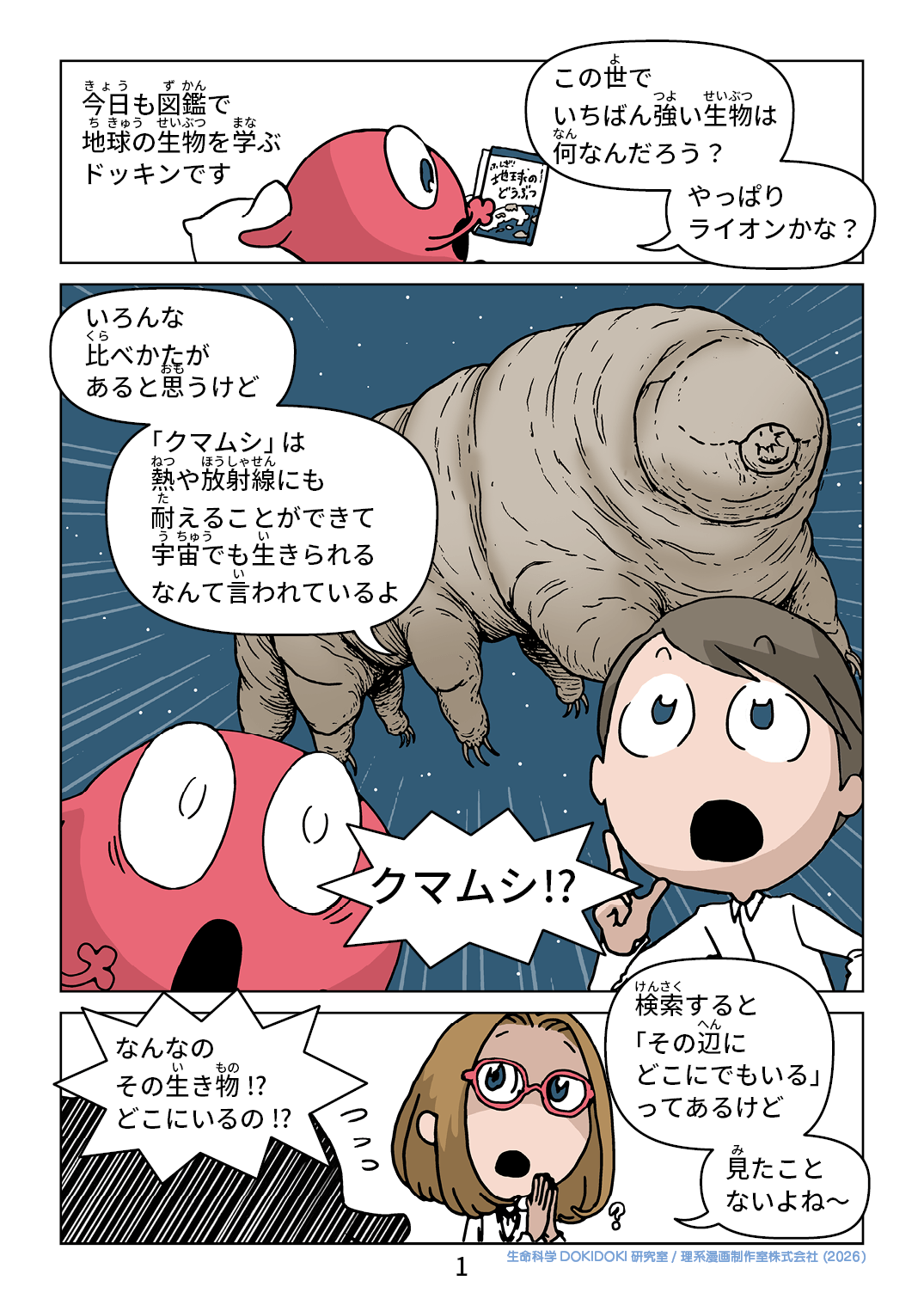 今日も図鑑で 地球の生物を学ぶ ドッキンです この世で いちばん強い生物は 何なんだろう? やっぱり ライオンかな? いろんな 比べかたが あると思うけど 「クマムシ」は 熱や放射線にも 耐えることができて 宇宙でも生きられる なんて言われているよ クマムシ!? なんなの その生き物!? どこにいるの!? 検索すると 「その辺に どこにでもいる」 ってあるけど 見たこと ないよね〜