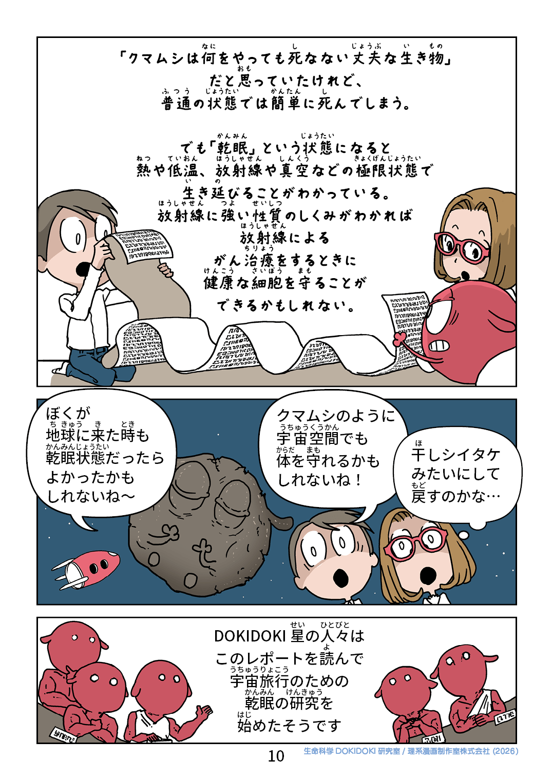 「クマムシは何をやっても死なない丈夫な生き物」 だと思っていたけれど、 普通の状態では簡単に死んでしまう。 でも「乾眠」という状態になると 熱や低温、放射線や真空などの極限状態で 生き延びることがわかっている。 放射線に強い性質のしくみがわかれば 放射線による がん治療をするときに 健康な細胞を守ることが できるかもしれない。 ぼくが 地球に来た時も 乾眠状態だったら よかったかも しれないね〜 クマムシのように 宇宙空間でも 体を守れるかも しれないね! 干しシイタケ みたいにして 戻すのかな… DOKIDOKI星の人々は このレポートを読んで 宇宙旅行のための 乾眠研究を 始めたそうです