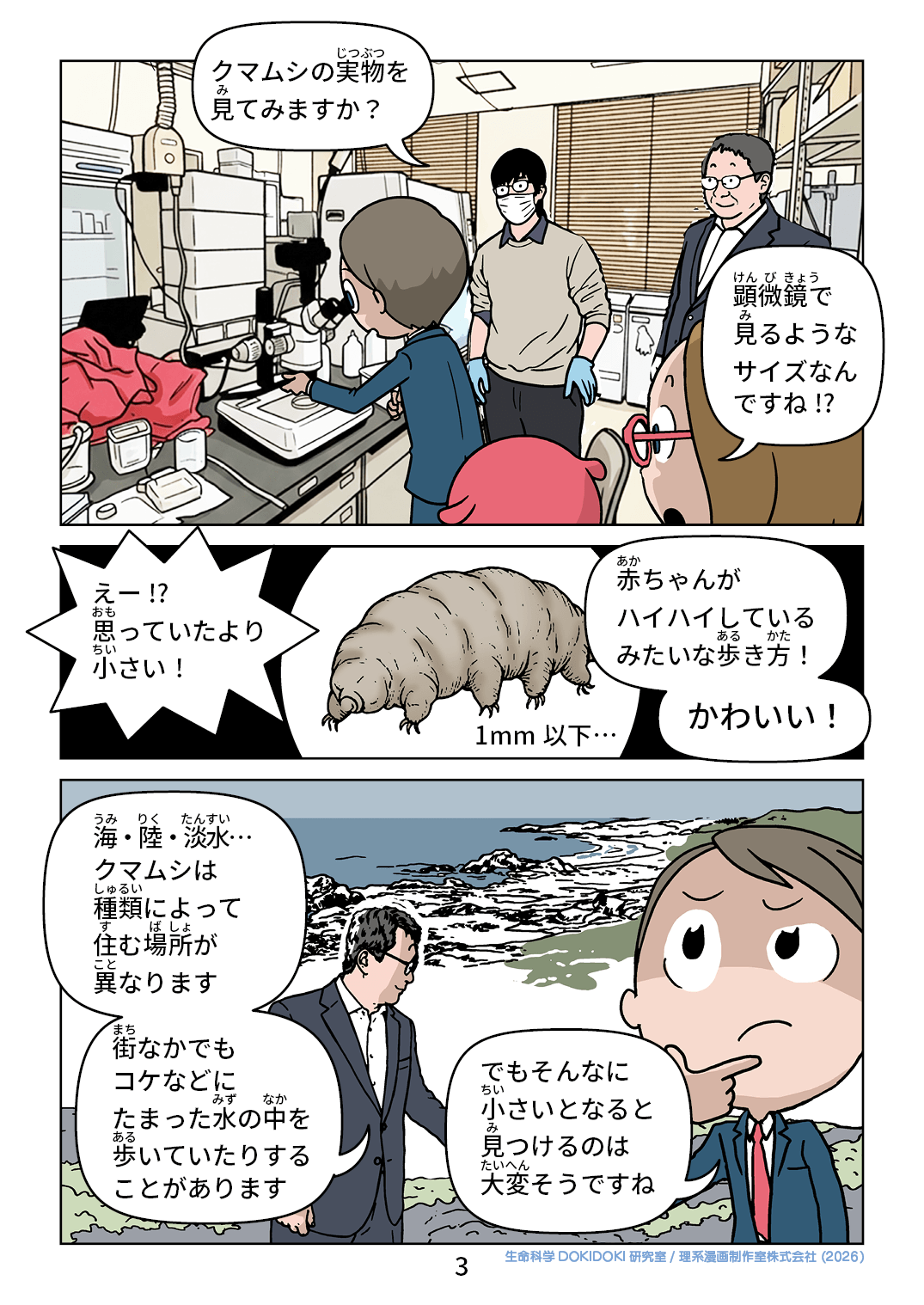 クマムシの実物を 見てみますか? 顕微鏡で 見るような サイズなん ですね!? えー!? 思っていたより 小さい! 1mm以下… 赤ちゃんが ハイハイしている みたいな歩き方! かわいい! 海・陸・淡水 …クマムシは 種類によって 住む場所が 異なります 街なかでも コケなどに たまった水の中を歩いていたりする ことがあります でもそんなに 小さいとなると 見つけるのは 大変そうですね