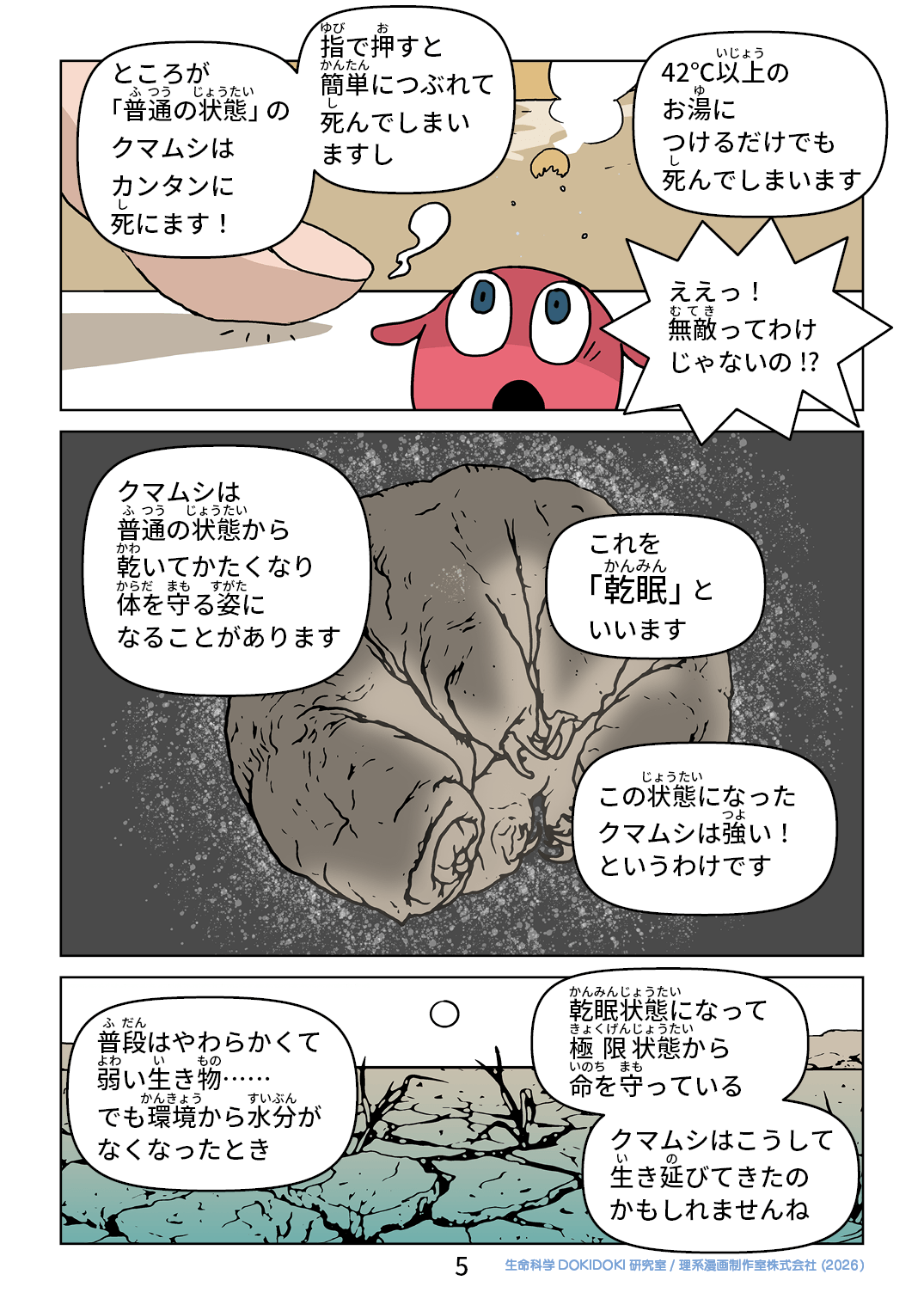 ところが 「普通の状態」の クマムシは カンタンに 死にます! 指で押すと 簡単につぶれて 死んでしまい ますし 42℃以上の お湯に つけるだけでも 死んでしまいます ええっ! 無敵ってわけ じゃないの!? クマムシは 普通の状態から 乾いてかたくなり 体を守る姿に なることがあります これを 「乾眠」と いいます この状態になった クマムシは強い! というわけです 普段はやわらかくて 弱い生き物…… でも環境から水分が なくなったとき 乾眠状態になって 極限状態から 命を守っている クマムシはこうして 生き延びてきたの かもしれませんね