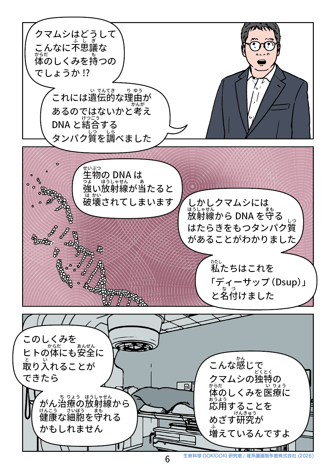 クマムシはどうして こんなに不思議な 体のしくみを持つの でしょうか!? これには遺伝的な理由が あるのではないかと考え DNAと結合する タンパク質を調べました 生物のDNAは 強い放射線が当たると 破壊されてしまいます しかしクマムシには 放射線からDNAを守る はたらきをもつタンパク質が あることがわかりました 私たちはこれを 「ディーサップ(Dsup)」と名付けました このしくみを ヒトの体にも安全に 取り入れることが できたら がん治療の放射線から健康な細胞を守れる かもしれません こんな感じで クマムシの独特の 体のしくみを医療に応用することを めざす研究が 増えているんですよ