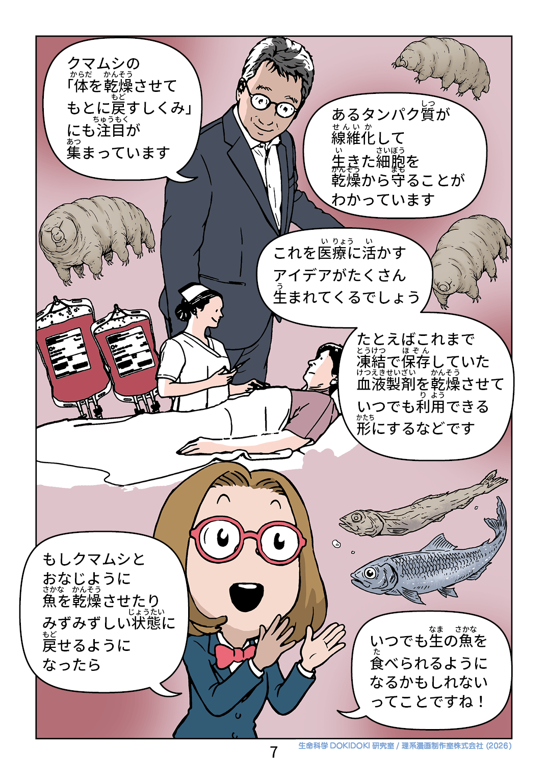 クマムシの 「体を乾燥させて もとに戻すしくみ」 にも注目が 集まっています あるタンパク質が線維化して生きた細胞を乾燥から守ることが わかっています これを医療に活かす アイデアがたくさん 生まれてくるでしょう たとえばこれまで 凍結で保存していた 血液製剤を乾燥させて いつでも利用できる 形にするなどです もしクマムシと おなじように 魚を乾燥させたり みずみずしい状態に 戻せるように なったら いつでも生の魚を 食べられるように なるかもしれない ってことですね!