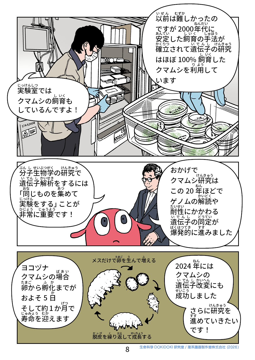 実験室では クマムシの飼育も しているんですよ! 以前は難しかったのですが 2000年代に 安定した飼育の手法が確立されて 遺伝子の研究はほぼ100%飼育したクマムシを 利用しています 分子生物学の研究で 遺伝子解析をするには 「同じものを集めて 実験をする」ことが 非常に重要です! おかげで クマムシ研究は この20年ほどで ゲノムの解読や 耐性にかかわる 遺伝子の同定が 爆発的に進みました ヨコヅナクマムシは 卵から孵化までが およそ5日 そして約1か月で 寿命を迎えます 2024年には クマムシの 遺伝子改変にも 成功しました さらに研究を 進めていきたい です!