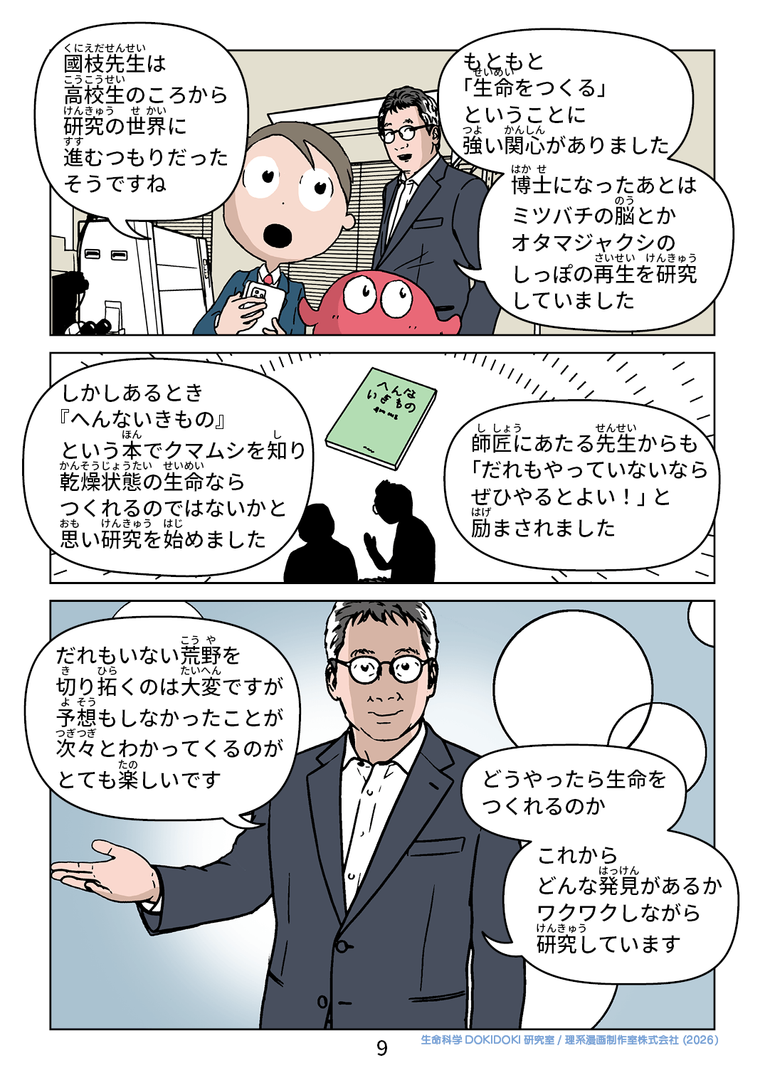 國枝先生は 高校生のころから 研究の世界に 進むつもりだったそうですね 「生命をつくる」 ということに 強い関心がありました 博士になったあとは ミツバチの脳とか オタマジャクシの しっぽの再生を研究 していました しかしあるとき 『へんないきもの』 という本でクマムシを知り 乾燥状態の生命なら つくれるのではないかと 思い研究を始めました 師匠にあたる先生からも 「だれもやっていないなら ぜひやるとよい!」と 励ましがありました だれもいない荒野を 切り拓くのは大変ですが 予想もしなかったことが 次々とわかってくるのが とても楽しいです どうやったら生命をつくれるのか これから どんな発見があるか ワクワクしながら 研究しています