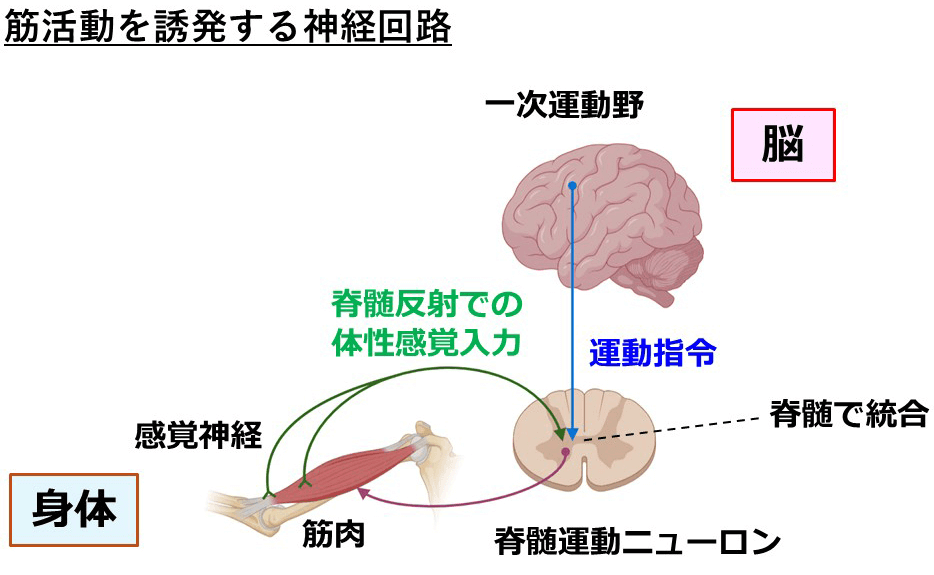 脳の運動野からの意識的な運動指令と、手足の感覚神経からの反射的な感覚入力とが脊髄で統合されて、筋肉が活動する。