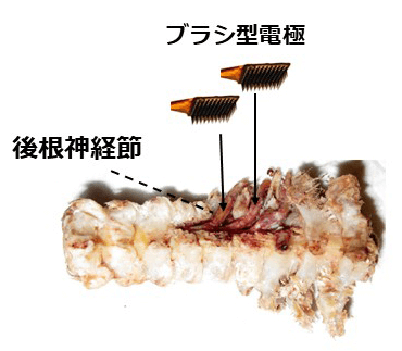 感覚受容器の細胞体が集まる後根神経節は脊椎(背骨)の中にある。感覚受容器の活動を同時に多数記録するためにブラシ型電極を後根神経節に埋め込んだ。(Umeda et al., Front. Neurosci. 2014を改変)