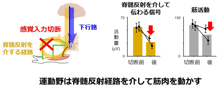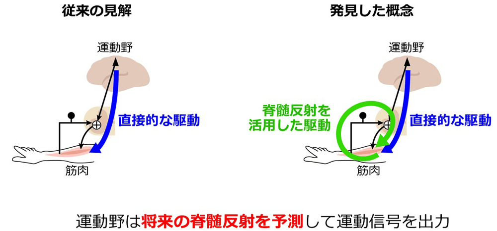 反射経路を含む回路をベースに調べた結果、運動野は筋肉を直接駆動するだけでなく、脊髄反射も巧みに利用して筋活動を駆動していた。つまり、運動野が将来の脊髄反射を予測して運動信号を発していることがわかった。