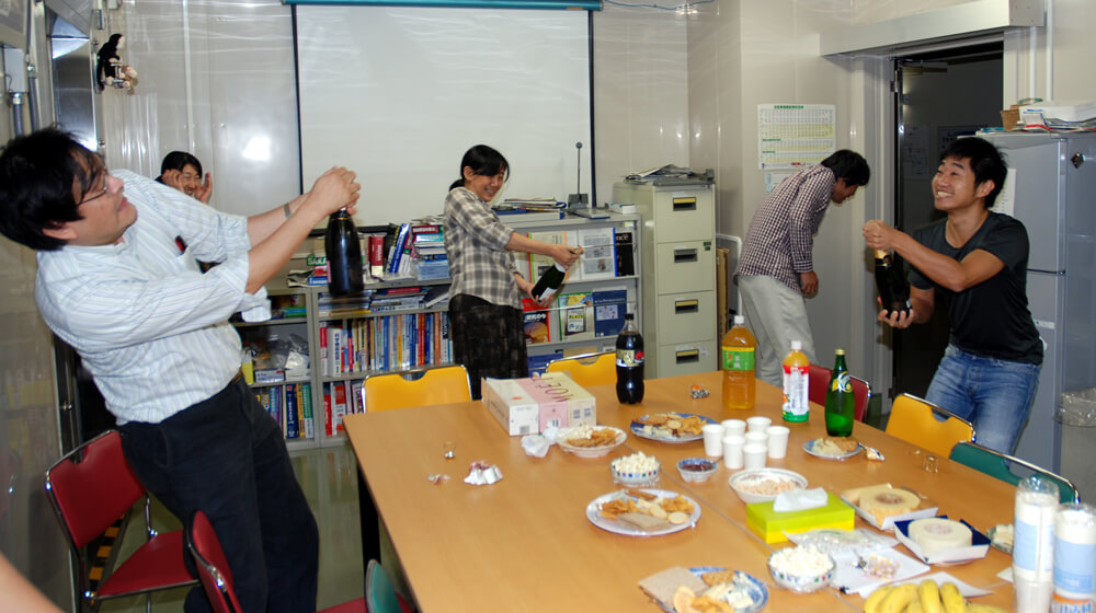 2011年に生理学研究所・伊佐研究室での論文が出版されたときのお祝い。梅田先生(右)と伊佐教授(左)。